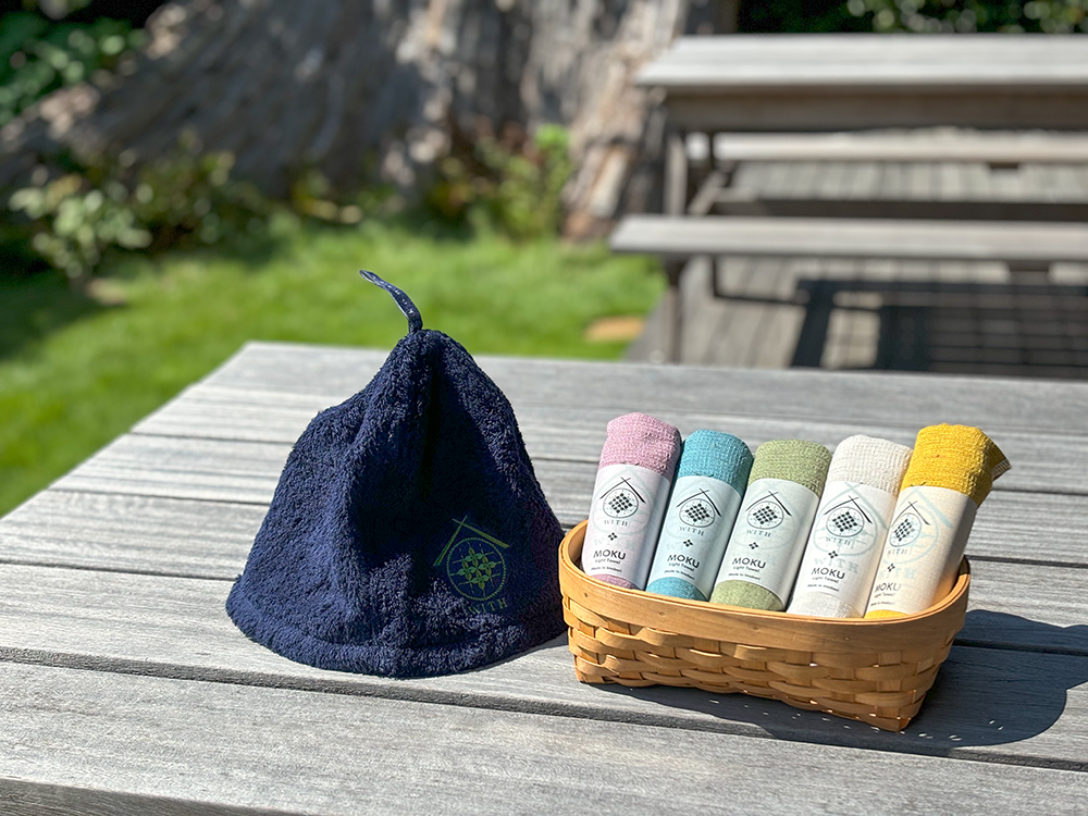また、機能性・デザイン性に優れたWITH KAMAKURAオリジナルグッズ(POCKETサウナハット、MOKUタオル)も販売しております。